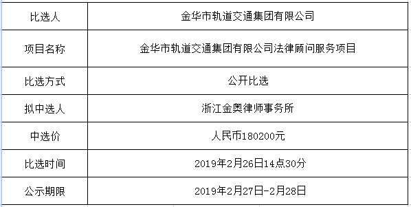 (金華市軌道交通集團(tuán)有限公司法律顧問(wèn)服務(wù)項(xiàng)目)中選公示